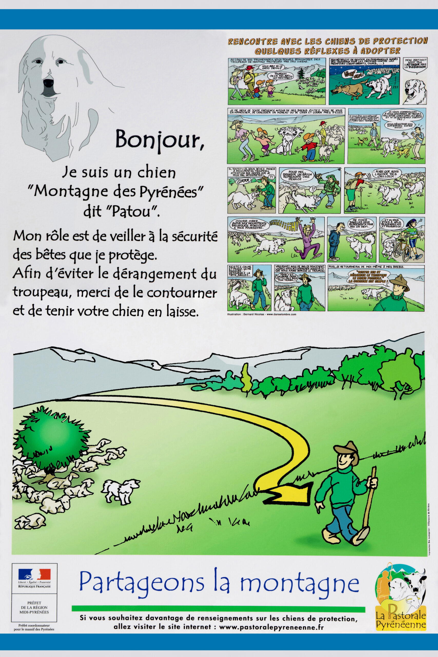 Waar je ze gelukkig ook nog tegenkomt is in de bergen bij de schapen. Op wandelingen zijn ontmoetingen niet altijd te vermijden en dan is het zaak om je aan de regels te houden. De regels van de Pyreneese berghond welteverstaan. Een Patou is altijd waakzaam en zal altijd zijn kudde beschermen. Toch is de Pyreneese berghond geen agressieve hond. Hij zal altijd proberen om de fysieke confrontatie te vermijden. Of dat lukt hangt van de indringer af.